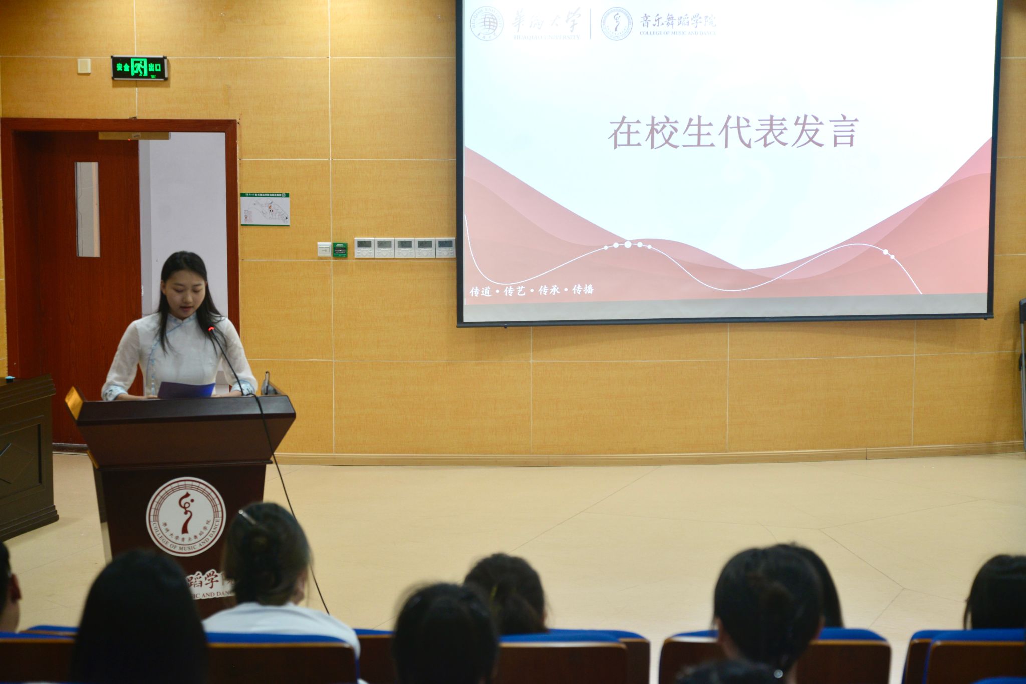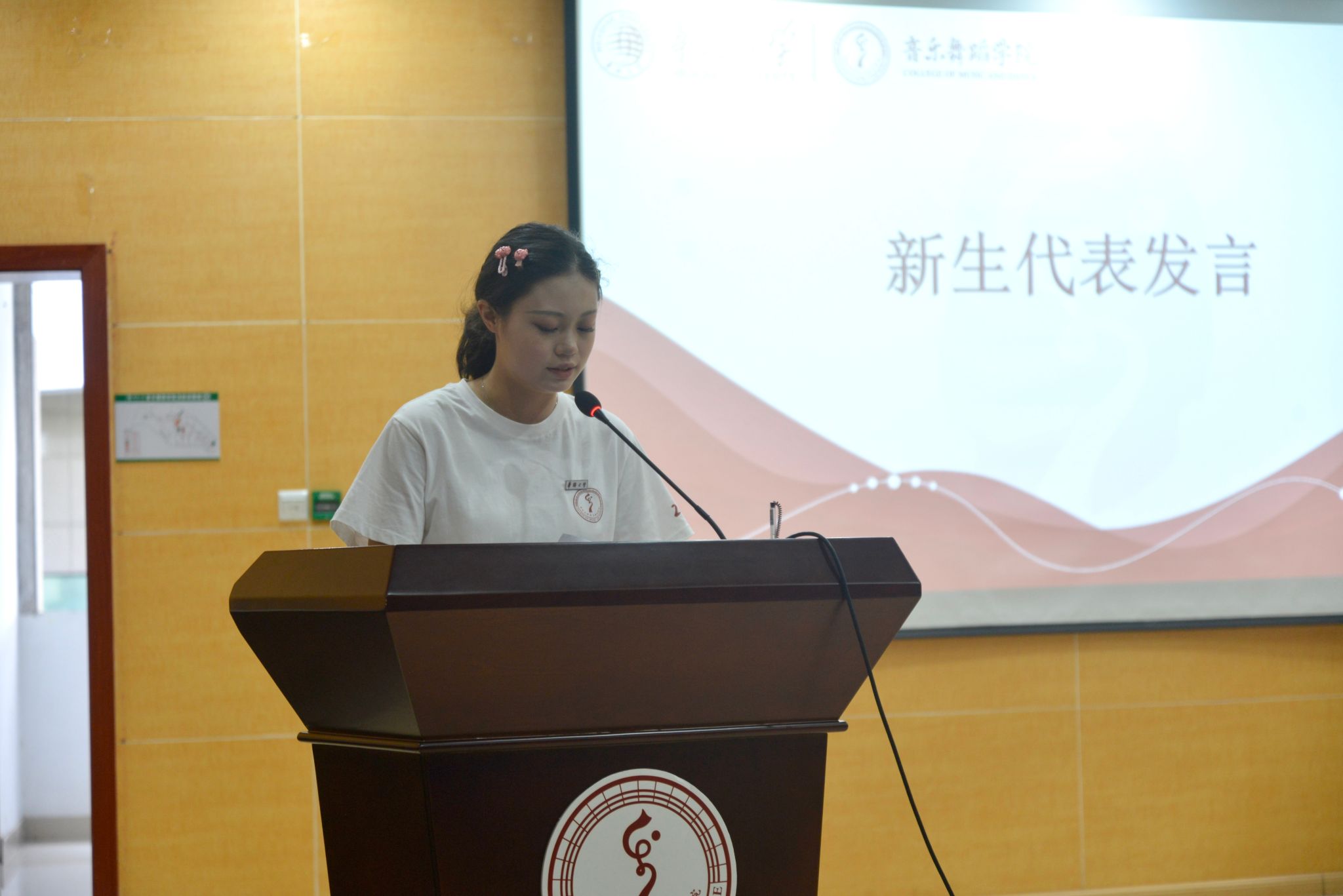 伴随着雄伟庄严的国歌,迎新大会正式拉开了序幕。首先由在校生代表,曾荣登中国顶尖舞者成长计划全国推选舞台、公司现任员工会主席团成员、2022级舞蹈学1班的戴伊冉同学发言,她结合自己在校的学习、生活和工作经历,为新生提供学习建议,如何在学习道路上不断前行、实现个人和艺术的共同发展。