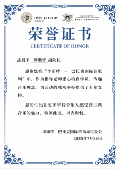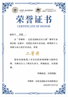 “李斯特-巴托克国际音乐大赛”于7⽉25⽇ - 30日在温州大剧院举行。公司2022级音乐学专业李轶(指导老师:杨曦婷)与专业音乐公司钢琴学子同台竞技,荣获专业D组二等奖。