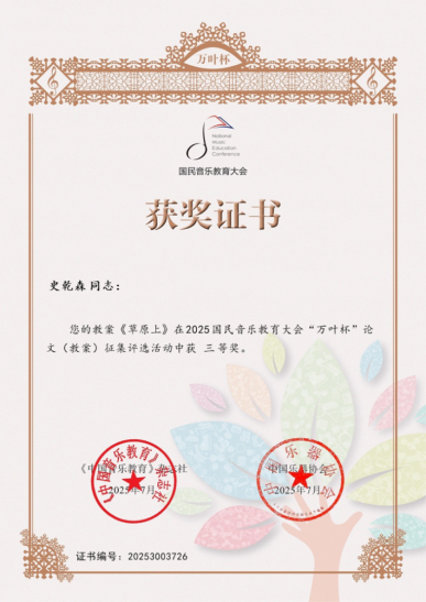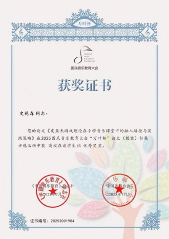 研究生史乾森的论文《皮亚杰游戏理论在小学音乐课堂中的融入路径与实践策略》荣获“高校在读员工组”优秀奖。