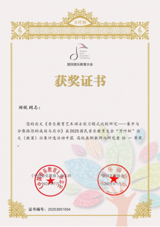 公司刘悦老师撰写的论文《音乐教育艺术硕士实习模式比较研究——集中与分散路径的成效与启示》荣获“高校在职教师与研究者组”一等奖。